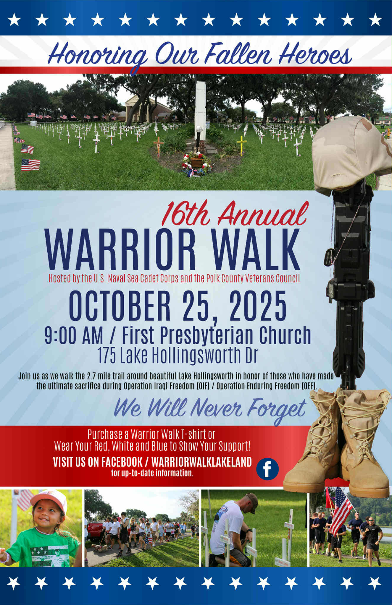 Good afternoon. One of our Club projects is the annual Warrior Walk around Lake Hollingsworth. This year it will be held on Saturday, October 25th. We will need a person to coordinate volunteers for the walk as well to help setting up the crosses at the lake the weekend prior (Saturday, October 18th).